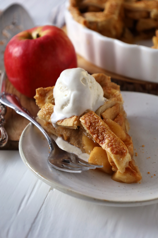 Crust 300 g (2 & 1/2 cup) flour 150 g (1 stick plus 2 & 1/2 tbsp) unsalted butter 1 tbsp light brown sugar 1 tsp salt 2 tbsp apple cider vinegar ½ large egg (reserve other 1/2 for brushing ) 6 -8 tbsp ice cold waterFilling 1 kg apples (about 7-8 apples) 2 tbsp lemon juice 100 g (1/2 cup) dark or light brown sugar 1 tsp vanilla extract 2 tbsp Calvados or Rum (optional) ½ tsp ground cinnamon pinch of salt 1 tbsp cornstarch (mixed with 2 tbsp water) 2 tbsp unsalted butterTopping remaining 1/2 egg plus 1 tbsp heavy/double cream Demerara or light brown sugar for sprinkling