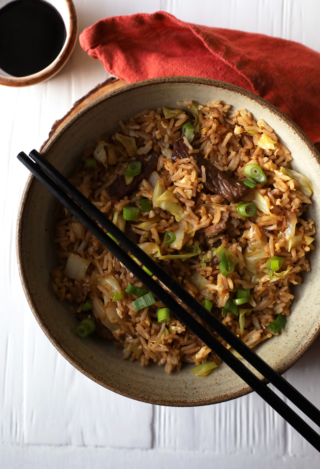 Cha Han 560 g (3 cups) Basmati or Japanese short grain rice 34 tbsp neutral oil 400 g (14 oz) beef, thinly sliced 3 eggs 120 g (1 cup) finely chopped onion 1 garlic clove, grated sesame oil scallions, finely choppedSauce 2 ½ tbsp Soya sauce 1 tbsp oyster sauce 1 tbsp mirin 1 ½ tsp dark brown sugar