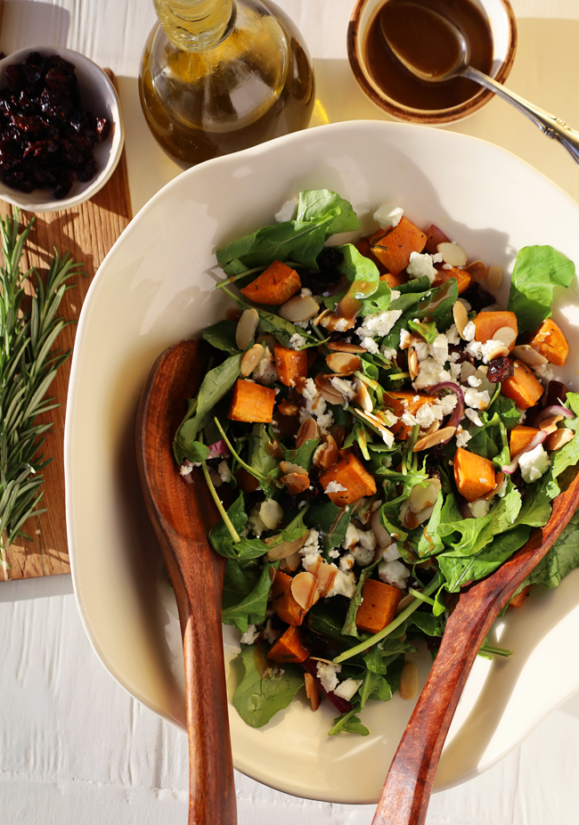 5. In a large serving bowl, combine the roasted sweet potatoes, rocket leaves, onions, and toasted almonds. Toss gently. Scatter over the dried cranberries and crumbled feta. Drizzle with the dressing just before serving.